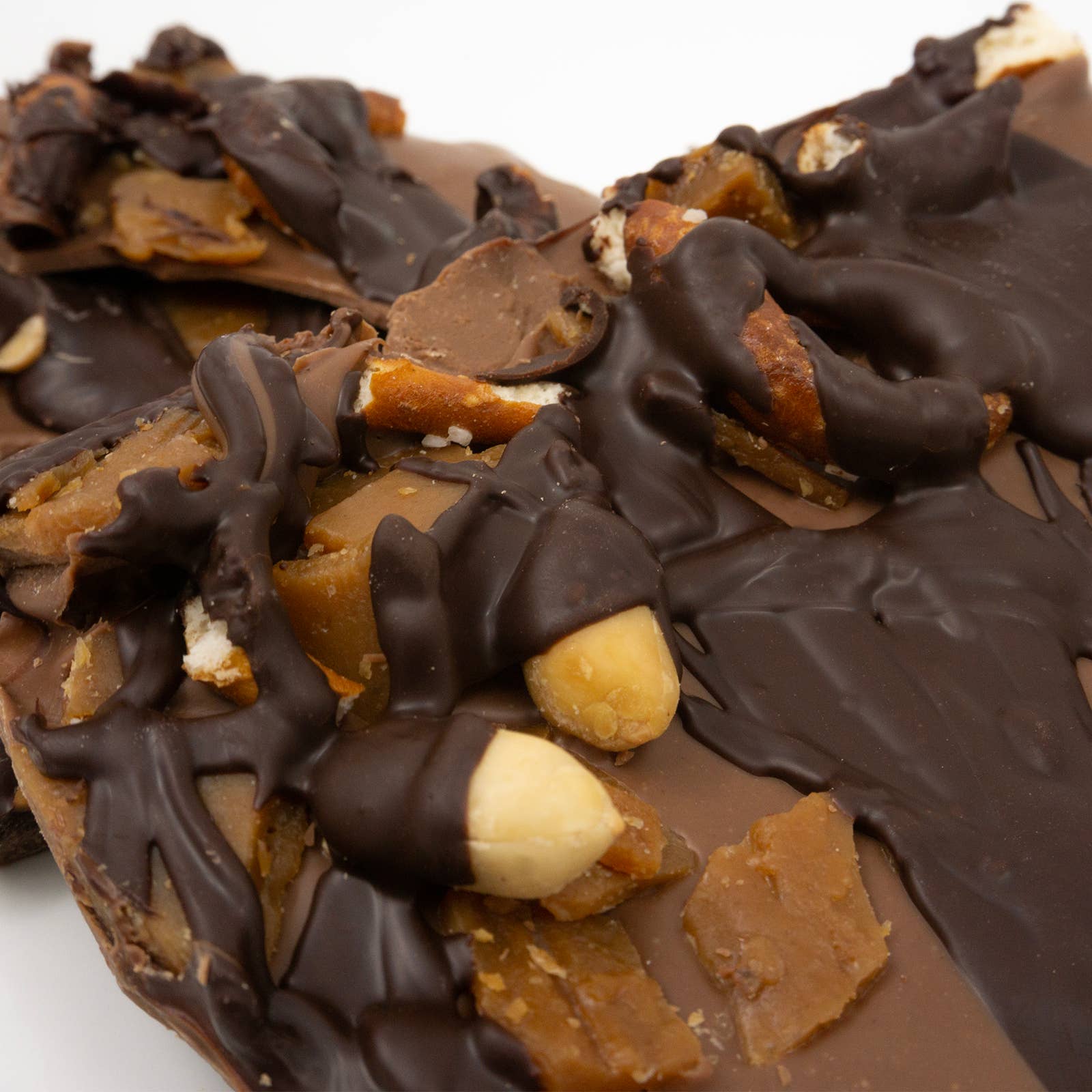 Our new Three Rivers Bark is the perfect combination of salty and sweet, crunchy and creamy. Rivers of toffee chips, pretzels and roasted peanuts settle into a smooth Swiss milk chocolate base with a heavy drizzle of our delightful bittersweet Belgian chocolate to make a delicious treat!