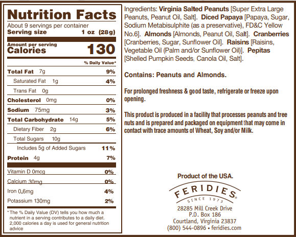 Named for US Route 58, the longest road in Virginia at 508 miles. Southampton County, along this historic highway, is home to FERIDIES®. Enjoy this delightful blend of tropical fruits and nuts. Ingredients include: Salted Peanuts, Salted Almonds, Papaya Dices, Pepitas, Select Raisins and Cranberries.