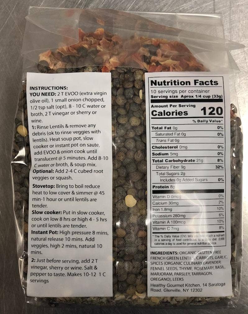 9 varieties of herbs and organic french green lentils make a hearty soup packed with flavor. Delicious hot or cold. Very easy soup to make and ready in 45 minutes. Makes ten one-cup servings, leftovers freeze beautifully. Vegan, vegetarian and naturally gluten-free. No added salt, sugar or MSG.