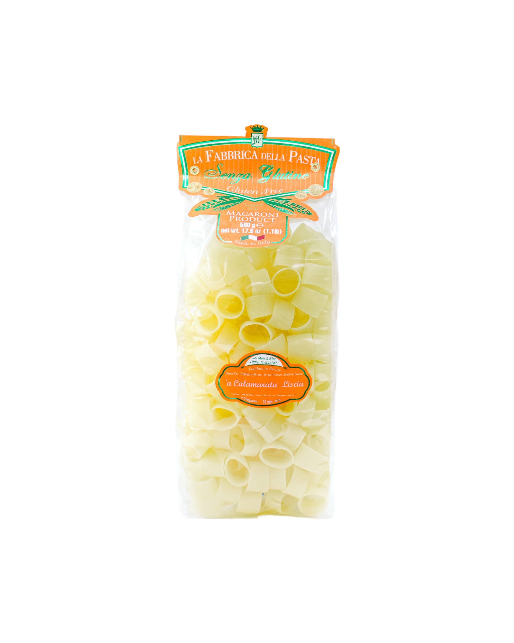 Gluten Free Calamarata Liscia is a tubular pasta shaped into thick rings, popular in southern Italy and typically served with seafood. La Fabbrica della Pasta is the first pasta factory in the world to make a bronze-drawn, artisinal pasta of Gragnano, that is completely gluten free. Made with the best rice and corn flour available and local spring water, bronze-drawn and slow-dried at a low temperature, this is true artisanal pasta from Gragnano. It has wonderful flavor and bite, maintaining its firmness after cooking. Use as you would any quality dry pasta. All of La Fabbrica della Pasta's gluten free products are made with special care in a separate, completely gluten-free facility to protect from any cross contamination.