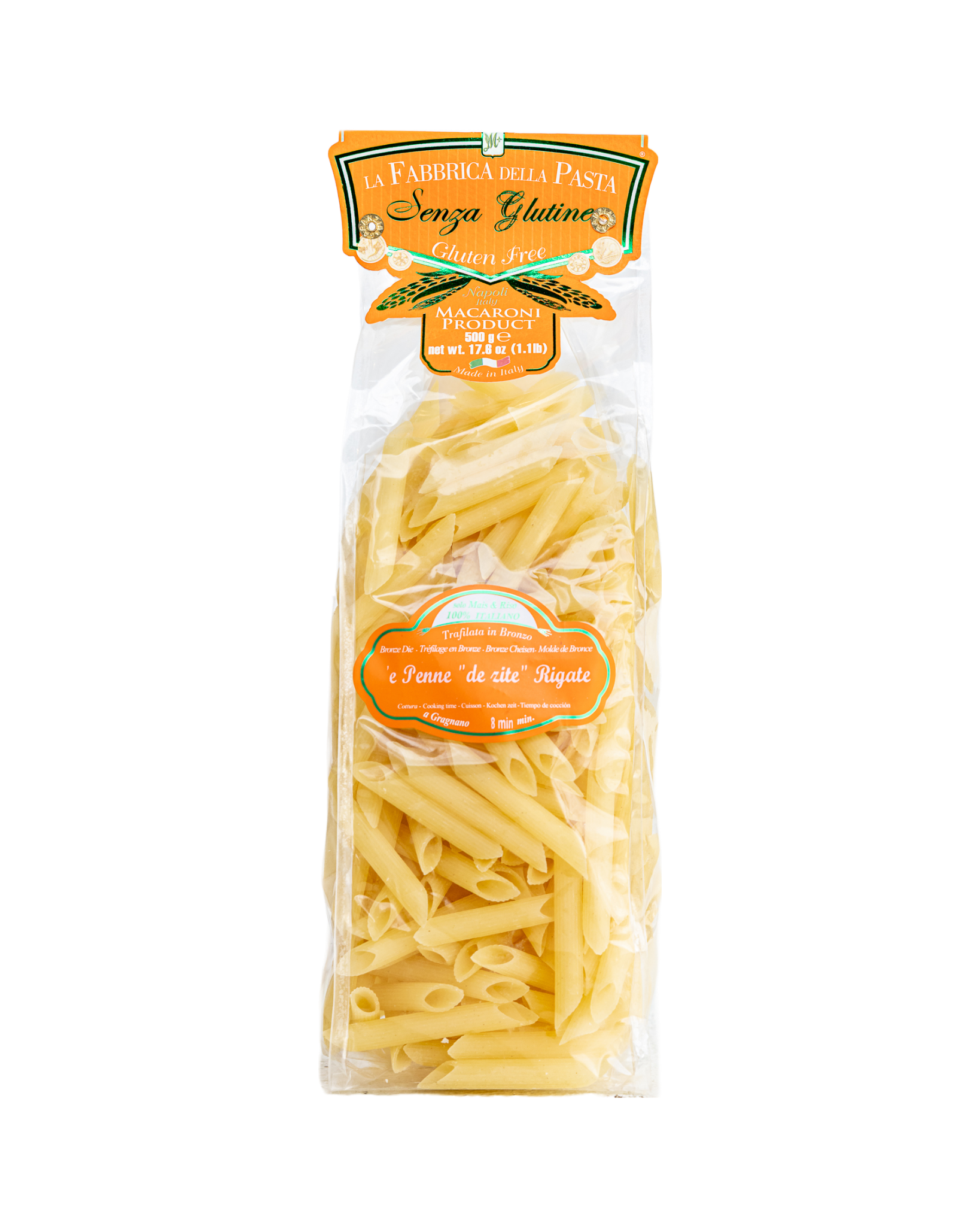 This classic, gluten free, ridged penne is a great staple to have in your pantry all year round. It’s ridged surface will absorb all the flavors of your favorite sauce. La Fabbrica della Pasta is the first pasta factory in the world to make a bronze-drawn, artisanal pasta of Gragnano, that is completely gluten free. Made with the best rice and corn flour available and local spring water, bronze-drawn and slow-dried at a low temperature, this is true artisanal pasta from Gragnano. It has wonderful flavor and bite, maintaining its firmness after cooking. Use as you would any quality dry pasta. All of La Fabbrica della Pasta's gluten free products are made with special care in a separate, completely gluten-free facility to protect from any cross contamination.