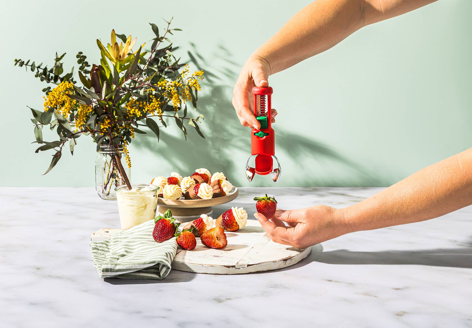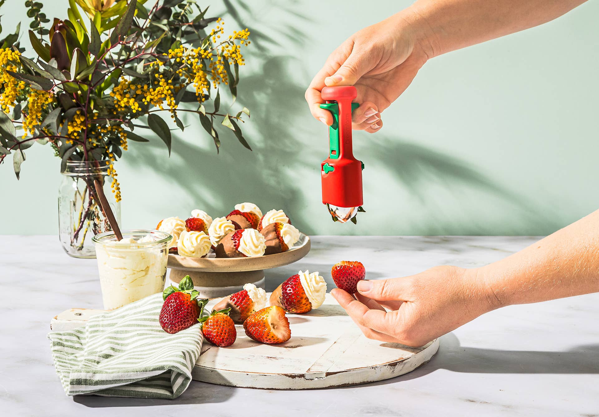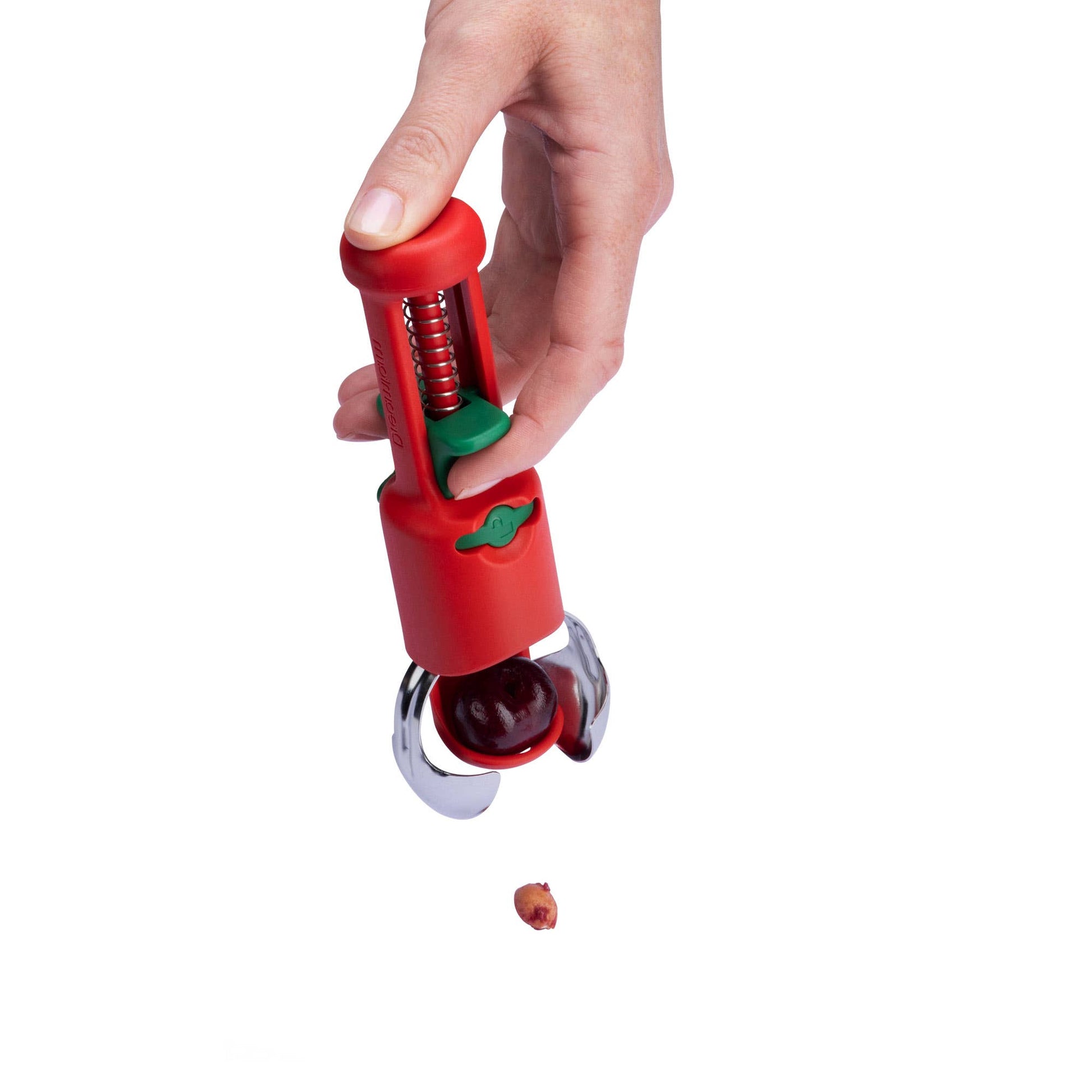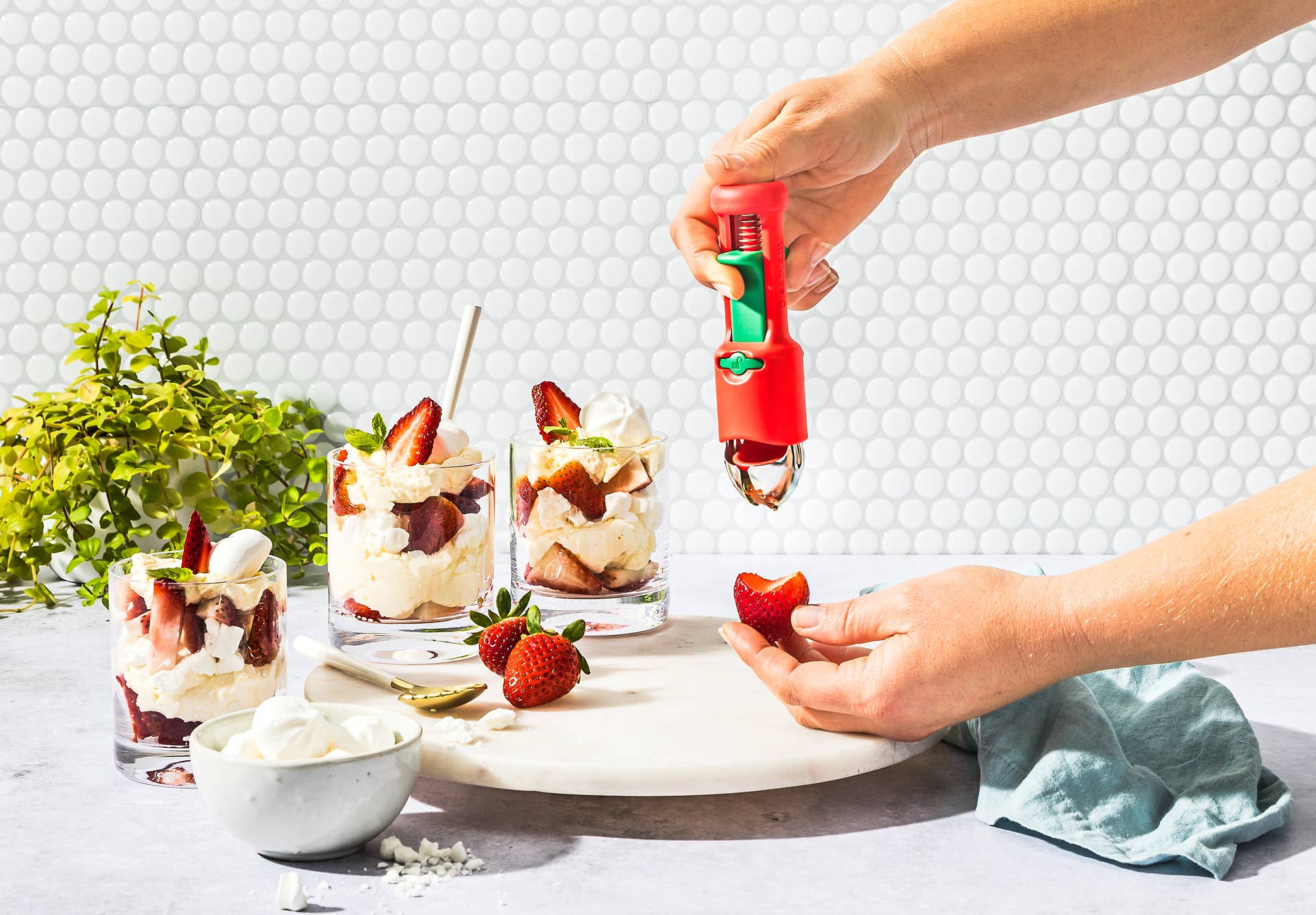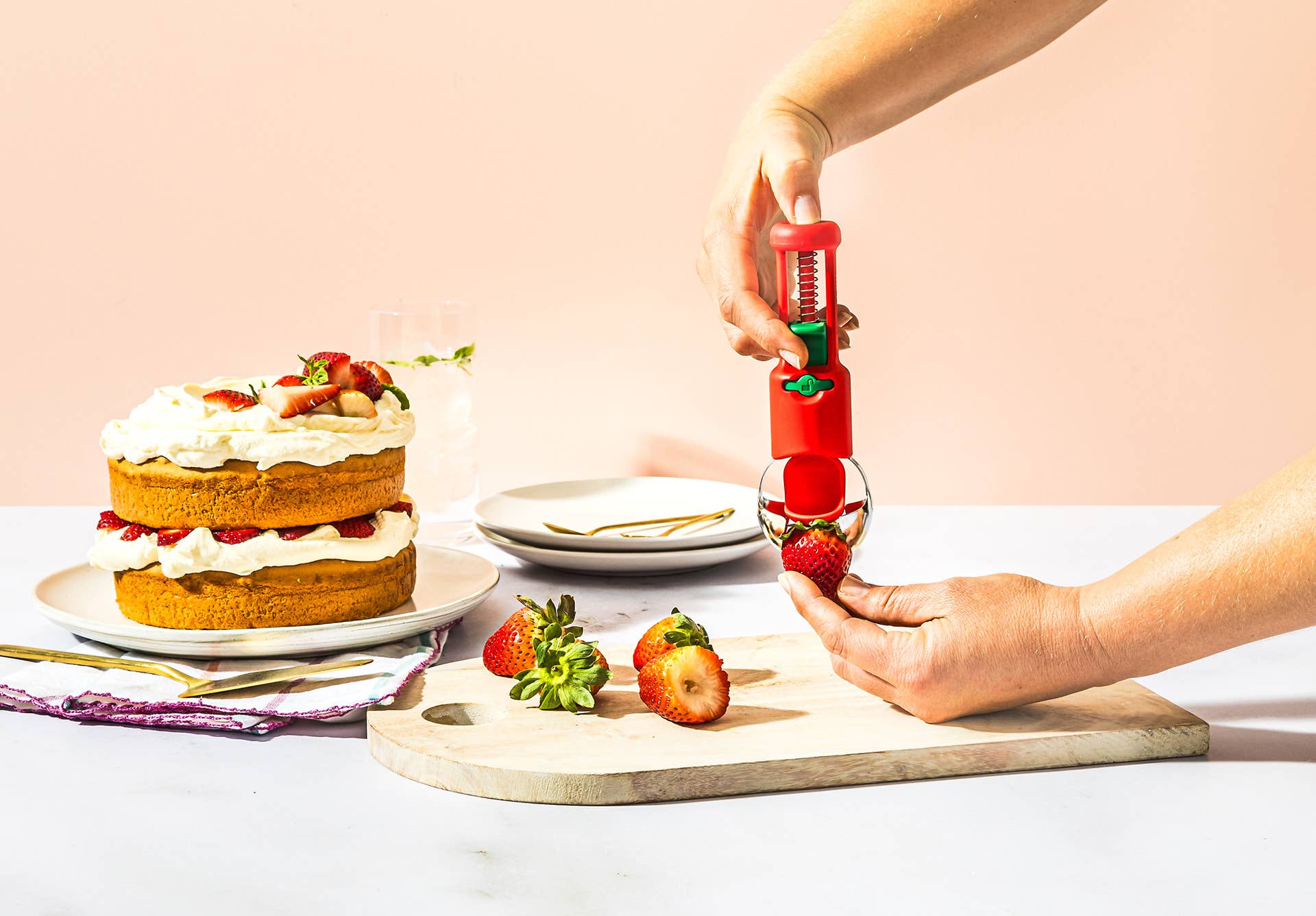 Dreamfarm Hullapit is a 3-in-1 berry tool that hulls strawberries, pits cherries and olives, and catches their stones.