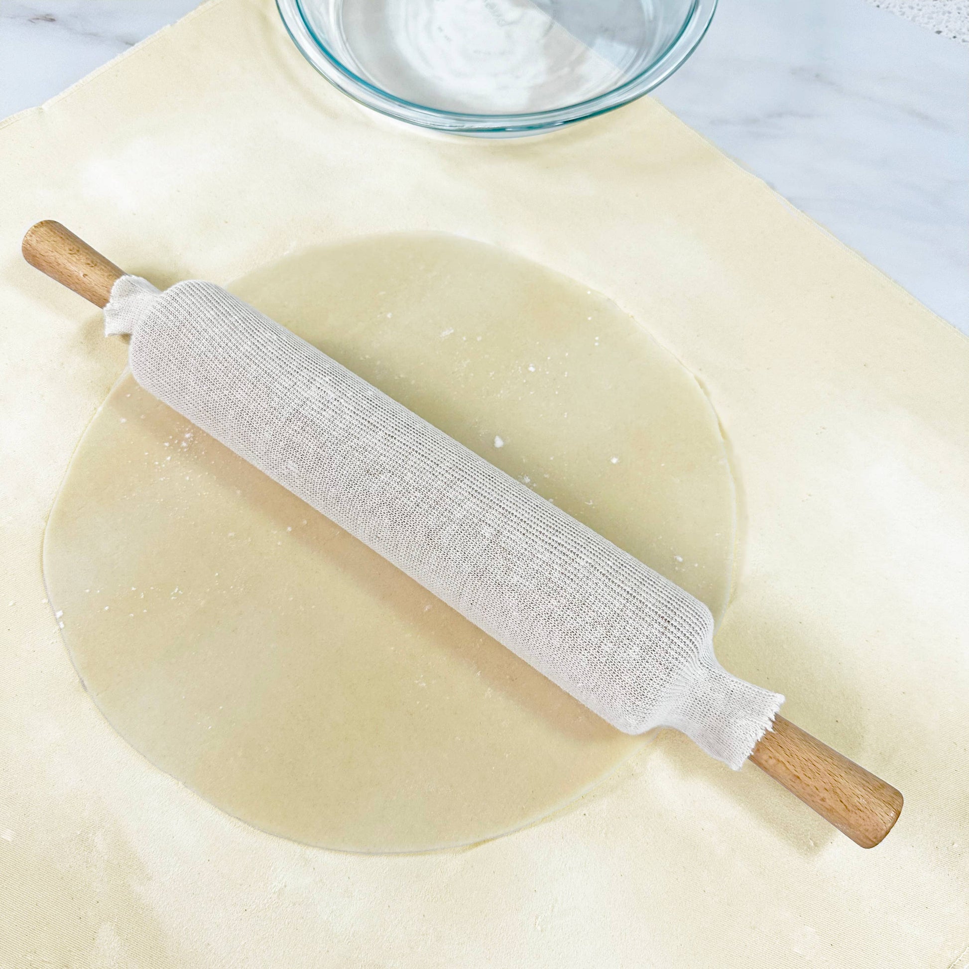 Set of 2 nonstick rolling pin covers are a great way to make rolling out pie dough easier. Rub flour into your rolling pin sleeve, the fabric absorbs excess flour and prevents your dough from sticking. Includes two 15" rolling pin covers. Hand wash and line dry.