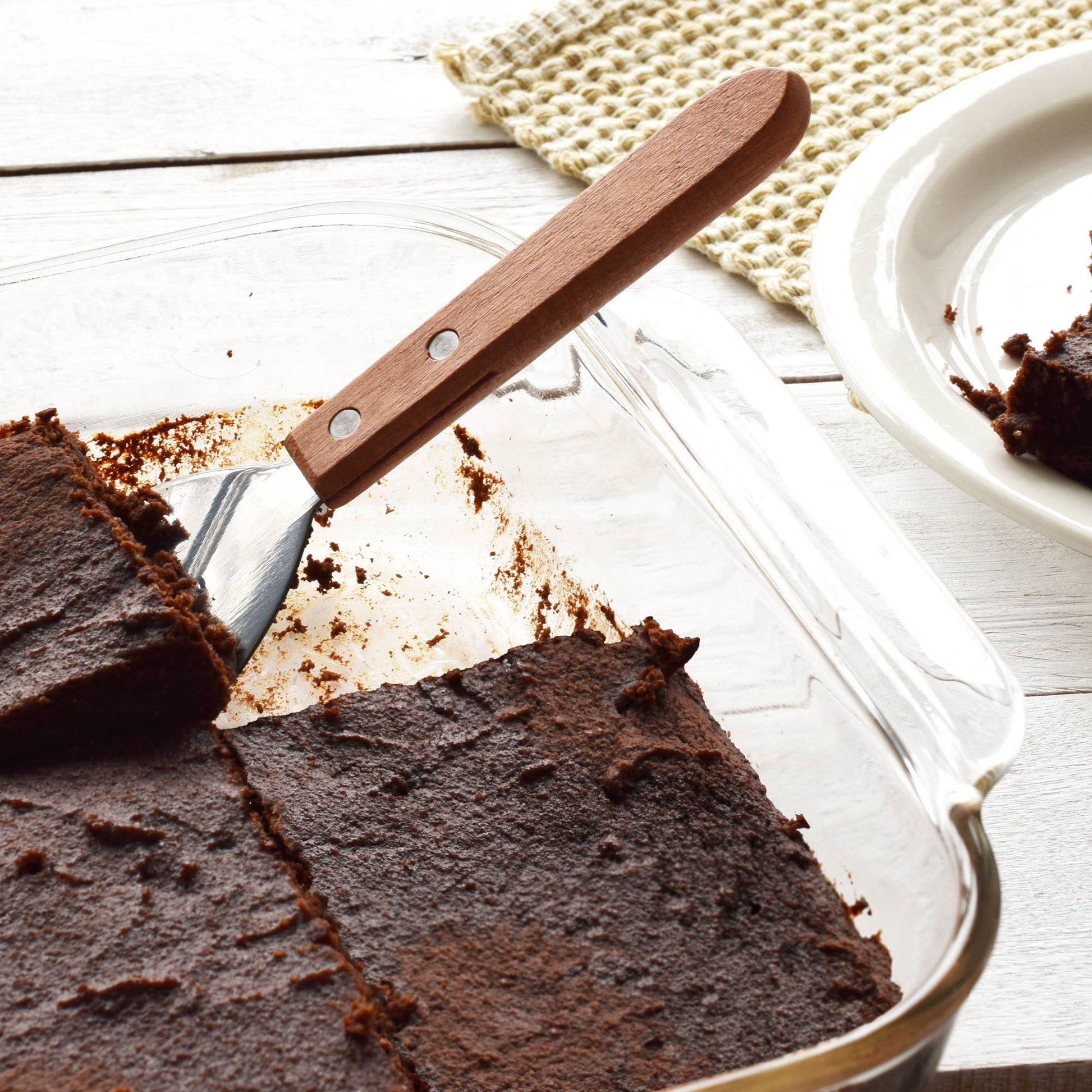 A customer favorite! Great for cooking and serving our stainless steel spatula is 7.5" Long. Perfect size for scooping cookies and brownies. Sturdy Wood handle. Hand wash and dry thoroughly before storing.